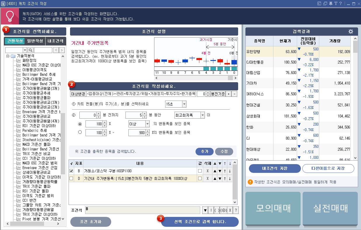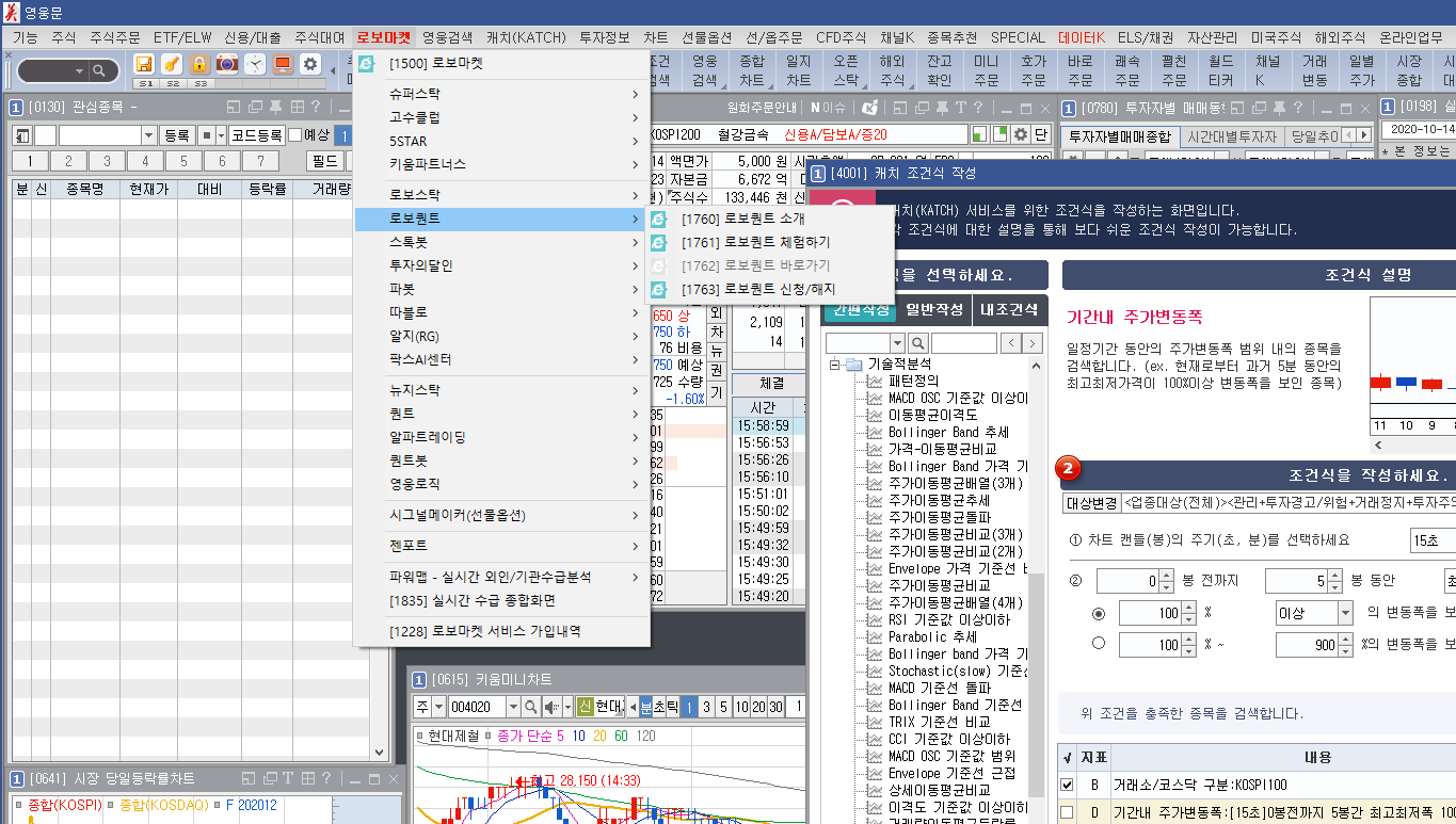 매수할 주식을 찾는 화면이다. 일반 조건검색 화면과 거의 동일하다. 이 검색조건식을 잘 만들면 나도 각종 찌라시를 뿌릴 수 있는 사람이 되는거다. 화면 왼쪽에 각종 기술적 분석 조건식이 있다. 강화학습이나 빅데이터 분석, 머신러닝 알고리즘은 이 보다도 훨씬 더 많은 외부 정보들을 활용하기 때문에 그 정도 단계까지 가게 되면 이제 출가를 해야겠지.