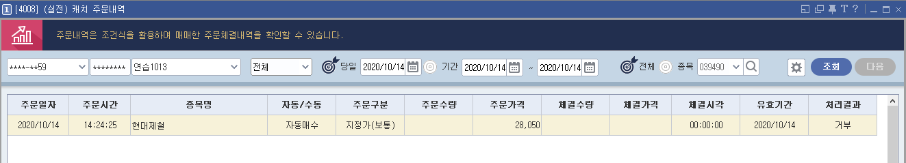 계좌에 잔고를 입금하지 않아서 체결은 되지 않았다. ㅎ;
